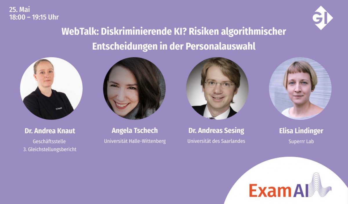 Darüber diskutierten am 25. Mai 2021 beim abendlichen WebTalk der Gesellschaft für Informatik Elisa Lindinger (Superrr Lab, Mit-Autorin der Expertise "AI Powered Recruiting?"), Angela Tschech (Martin-Luther-Universität Halle-Wittenberg), Dr. Andreas Sesing (Universität des Saarlandes, ExamAI) und Dr. Andrea Knaut (Geschäftsstelle Dritter Gleichstellungsbericht).