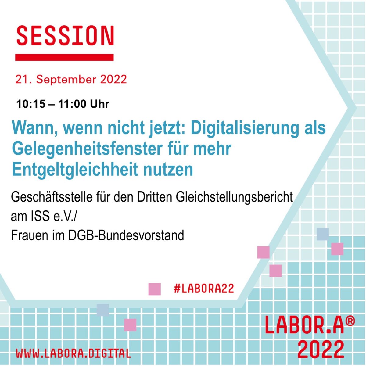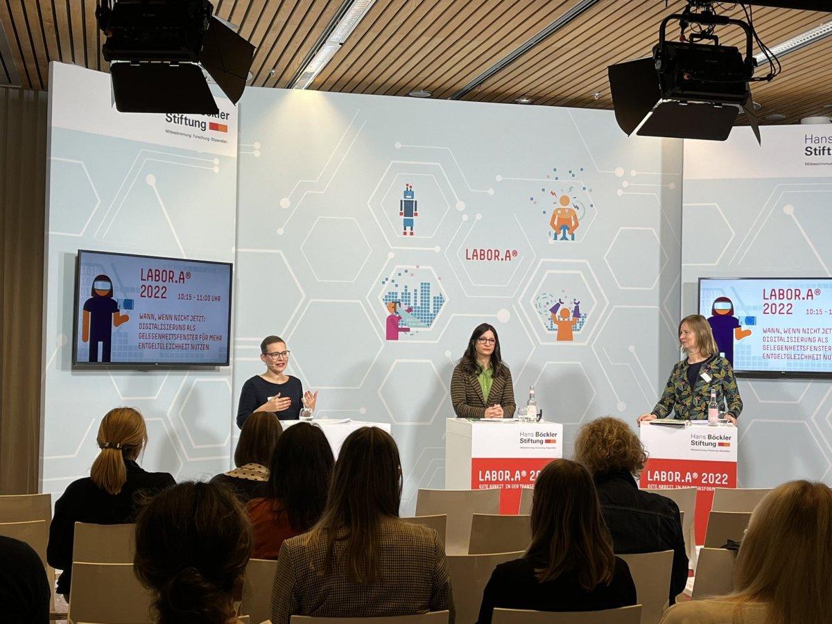 Am 21. September 2022 fand die Labor.a 2022 der Hans-Böckler-Stiftung statt. Angesichts gegenwärtiger gesellschaftlicher und wirtschaftlicher Transformationsprozesse beschäftigte sich die Konferenz mit der Frage der Gestaltung einer guten Arbeitswelt. Mit dabei war auch die Geschäftsstelle des Dritten Gleichstellungsberichts, die gemeinsam mit den Frauen im DGB Bundesvorstand als Programmpartnerin die Session ‚Wann, wenn nicht jetzt: Digitalisierung als Gelegenheitsfenster für mehr Entgeltgleichheit nutzen‘ gestaltete. Moderiert von Dr. Mara Kuhl, wissenschaftliche Mitarbeiterin der Geschäftsstelle Dritter Gleichstellungsbericht, diskutierten Dr. Alexandra Scheele und Elisa Rabe als Expertinnen aus Wissenschaft und Praxis zum Thema Entgeltgleichheit und Digitalisierung. Kurzfristig verhindert war Prof. Dr. Aysel Yollu-Tok, die als Vorsitzende der Sachverständigenkommission des Dritten Gleichstellungsberichts der Bundesregierung leider nicht wie geplant als dritte Teilnehmerin auf dem Podium dabei sein konnte.