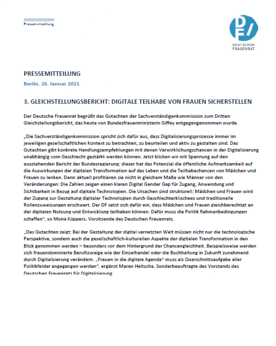 26.01.2021, Deutscher Frauenrat, Pressemitteilung: „3. Gleichstellungsbericht: Digitale Teilhabe von Frauen sicherstellen“