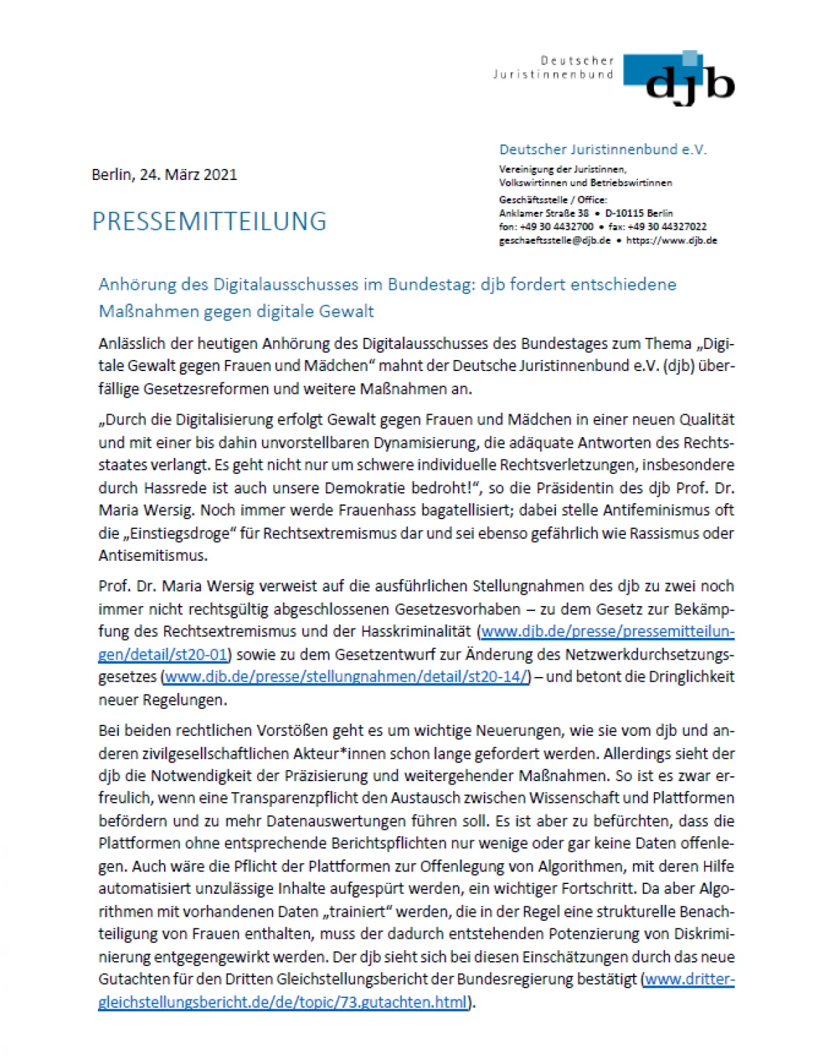 24.03.2021, Deutscher Juristinnenbund, Pressemitteilung: „Anhörung des Digitalausschusses im Bundestag: djb fordert entschiedene Maßnahmen gegen digitale Gewalt“