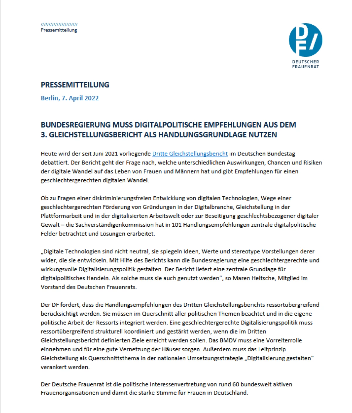 Link zur Pressemitteilung: https://www.frauenrat.de/wp-content/uploads/2022/04/220407-Pressemitteilung-Bundesregierung-muss-digitalpolitische-Empfehlungen-aus-dem-3.-Gleichstellungsbericht-als-Handlungsgrundlage-nutzen.pdf