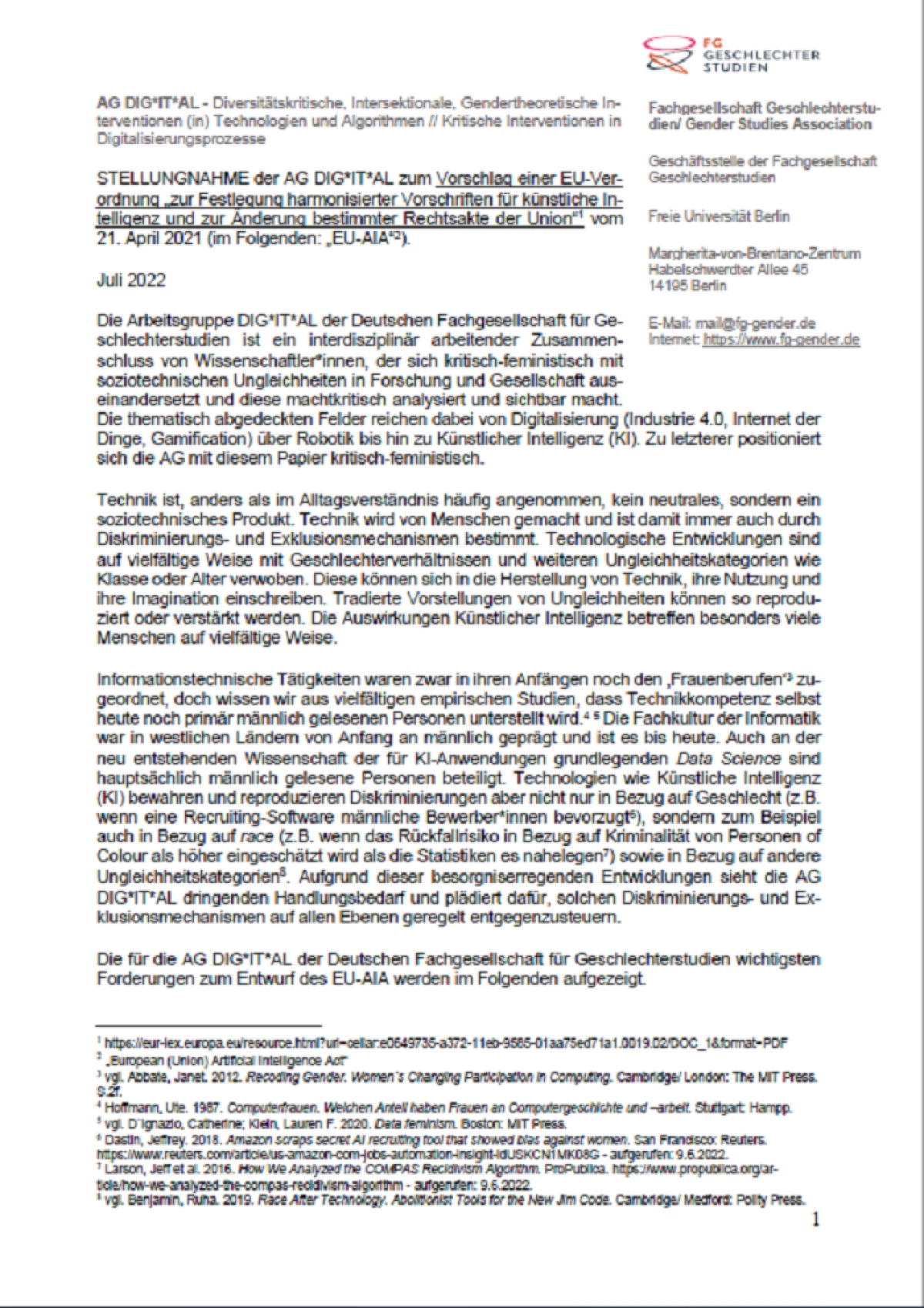 Gesamte Stellungnahme: http://www.fg-gender.de/wp-content/uploads/2022/07/Positionspapier-AG-DIG-IT-AL_EU-AIA_Juli2022_final.pdf