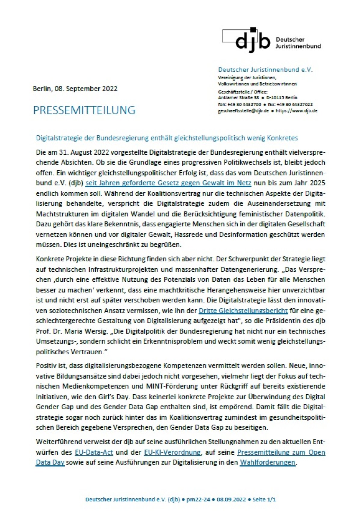 08.09.2022, Pressemitteilung des Deutschen Juristinnenbundes zum Anlass der Digitalstrategie der Bundesregierung: „Digitalstrategie der Bundesregierung enthält gleichstellungspolitisch wenig Konkretes“